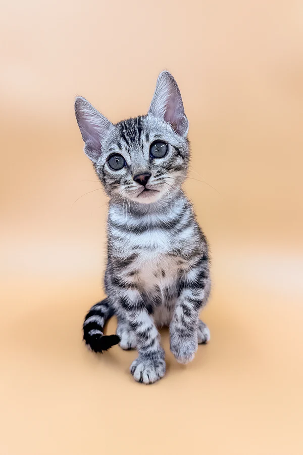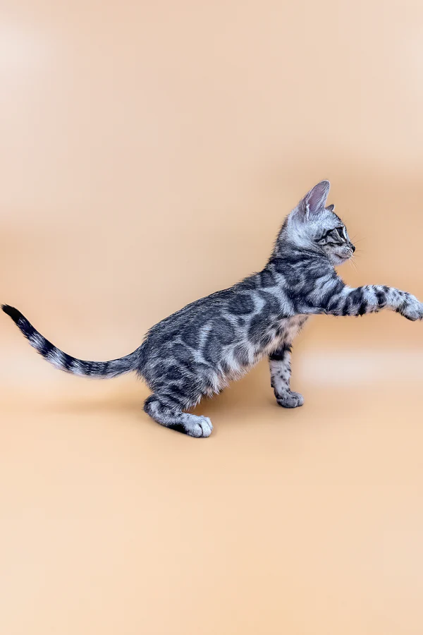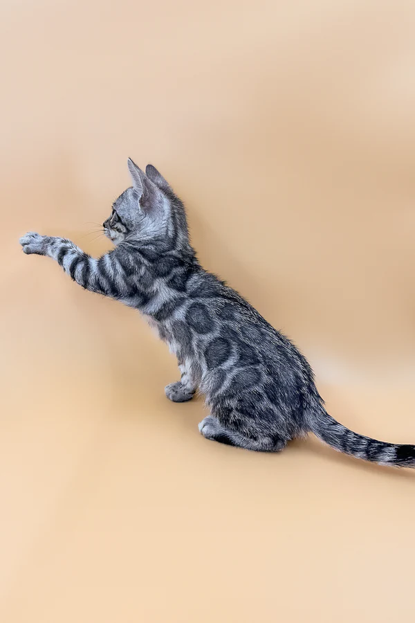 Meet Calvin, a striking male snow Bengal kitten with a stunning silver spotted tabby coat and captivating green eyes that are sure to draw attention. Calvin stands out with his bright, expressive sockets, sleek short hair, athletic body that showcases his refined bloodlines and impeccable breed type. Expected to weigh around 12-14 lbs when fully grown, he combines an elegant look with a warm, engaging personality.